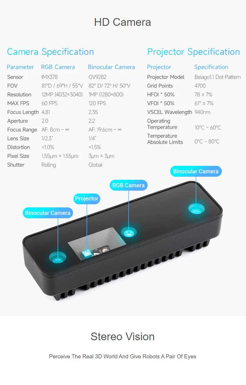 دید عمقی دقیق: با جفت دوربین استریو، میتواند فاصله را با دقت خوب اندازهگیری کند، که برای رباتیک خیلی حیاتی است.